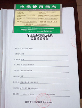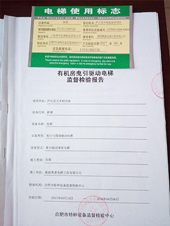 廬江縣五井村民組電梯經(jīng)合肥市特種設(shè)備監(jiān)督檢驗中心驗收合格,準(zhǔn)發(fā)《有機房曳引驅(qū)動電梯監(jiān)督檢驗報告》和《電梯使用標(biāo)志》。